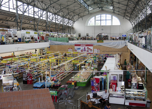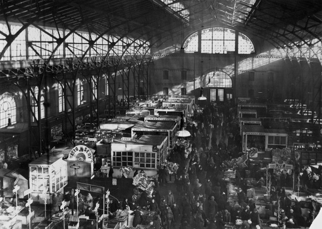 Stoiska w hali targowej - widok ogólny z góry. Zdjęcie wykonane przed 1939 rokiem.