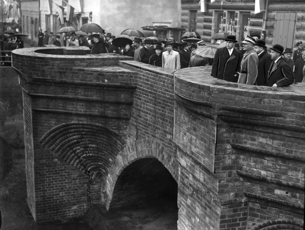 Warszawa. Stare Miasto. Uroczystość odsłonięcia murów obronnych przez marszałka Edwarda Rydza-Śmigłego. Zwiedzanie murów przez marszałka. Obok prezydent Warszawy Stefan Starzyński. 10 października 1938